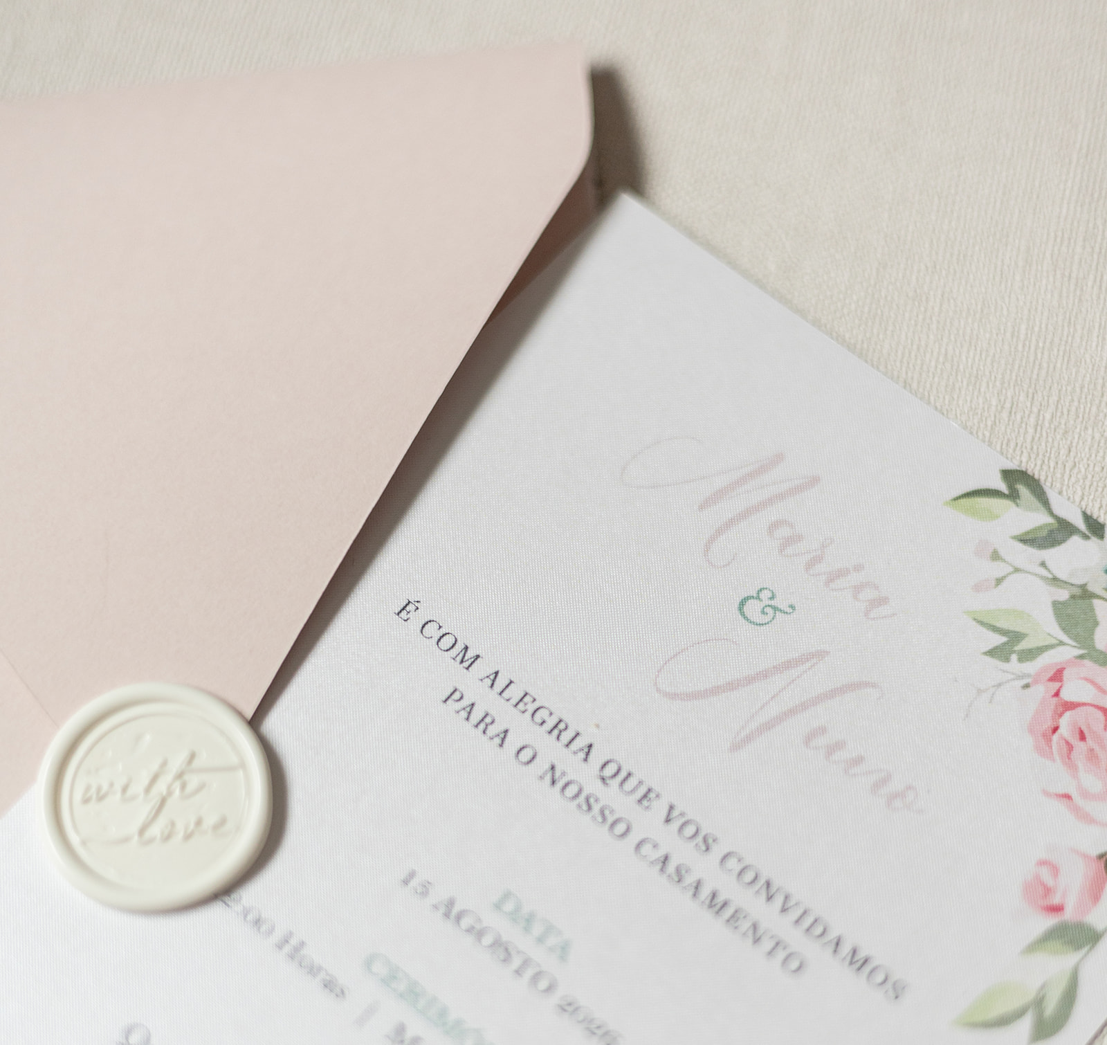 Decoração do convite: lacre dourado com frase With Love ( pode optar por qualquer desenho da nossa coleção)