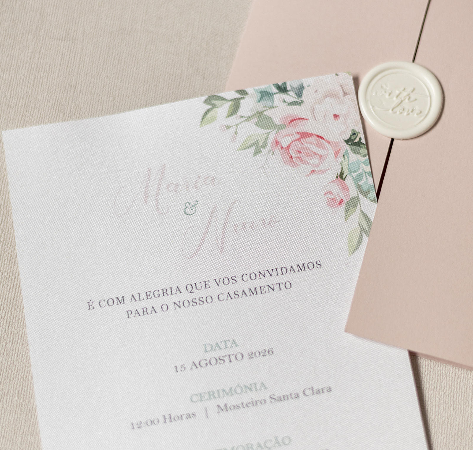 Convite de casamento verde pastel com lacre branco e design floral delicado. Um modelo elegante e minimalista para celebrações únicas.
