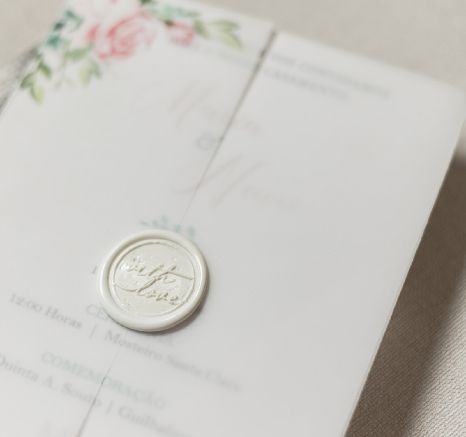 Convite de casamento com envelope translúcido e flores em tons rosa. Um design romântico e elegante, perfeito para casamentos intemporais.